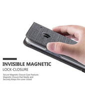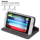 DESIGN: Modische Book Style Hülle im Stoff-Look mit Kunstleder-Applikation ohne störende Lasche oder Verschluss. Das Kartenfach und die Standfunktion machen dieses Case zu einem wahren Multitalent.