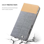DESIGN: Modische Book Style Hülle im Stoff-Look mit Kunstleder-Applikation ohne störende Lasche oder Verschluss. Das Kartenfach und die Standfunktion machen dieses Case zu einem wahren Multitalent.