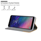 DESIGN: Modische Book Style Hülle im Stoff-Look mit Kunstleder-Applikation ohne störende Lasche oder Verschluss. Das Kartenfach und die Standfunktion machen dieses Case zu einem wahren Multitalent.