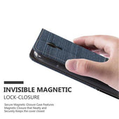 DESIGN: Modische Book Style Hülle im Stoff-Look mit Kunstleder-Applikation ohne störende Lasche oder Verschluss. Das Kartenfach und die Standfunktion machen dieses Case zu einem wahren Multitalent.