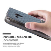 DESIGN: Modische Book Style Hülle im Stoff-Look mit Kunstleder-Applikation ohne störende Lasche oder Verschluss. Das Kartenfach und die Standfunktion machen dieses Case zu einem wahren Multitalent.