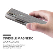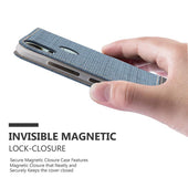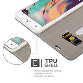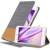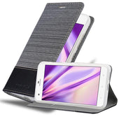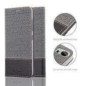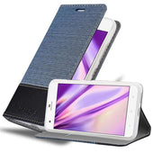 DESIGN: Modische Book Style Hülle im Stoff-Look mit Kunstleder-Applikation ohne störende Lasche oder Verschluss. Das Kartenfach und die Standfunktion machen dieses Case zu einem wahren Multitalent.