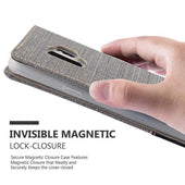DESIGN: Modische Book Style Hülle im Stoff-Look mit Kunstleder-Applikation ohne störende Lasche oder Verschluss. Das Kartenfach und die Standfunktion machen dieses Case zu einem wahren Multitalent.